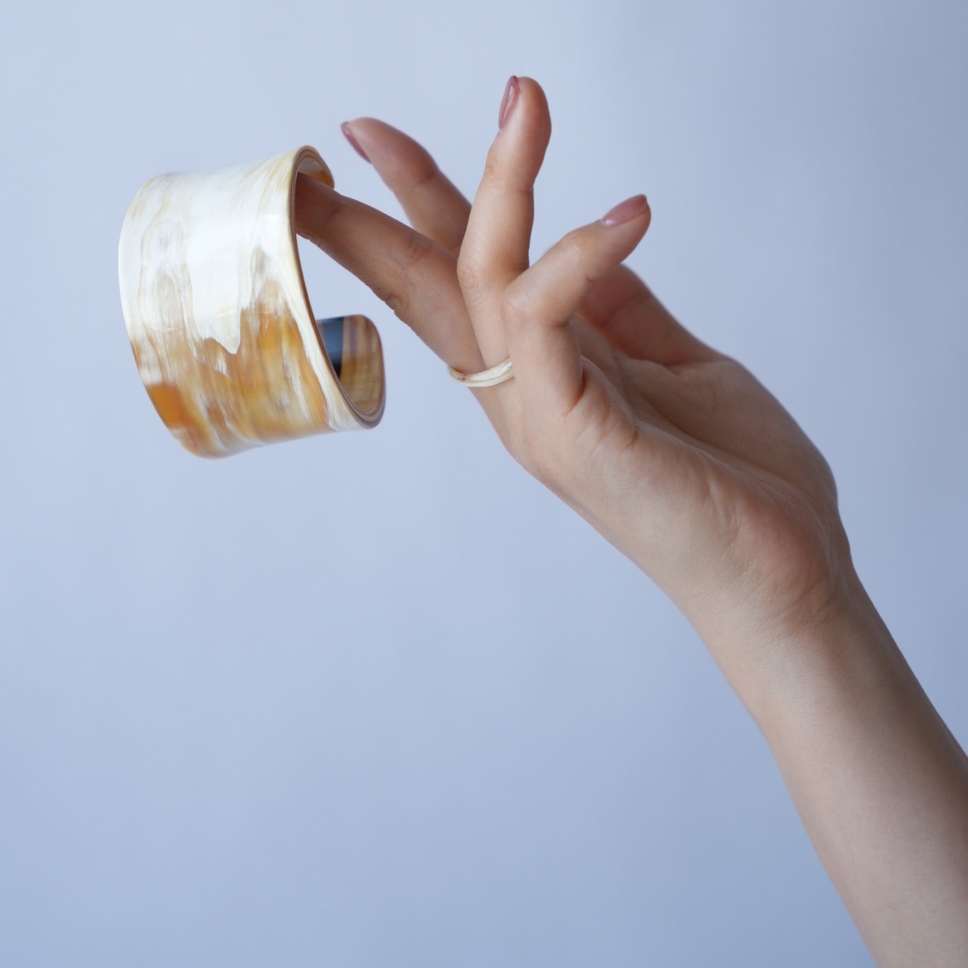 なめらかなカーブが印象的な Bangle Grande。ワイドなフォルムも上品なボリューム感。シンプルな装いにプラスするだけで、エレガントなアクセントになります。大き目のサイズ感は、シャツやニットの上からゆったりと着けて、洗練されたカジュアルスタイルが楽しめます。