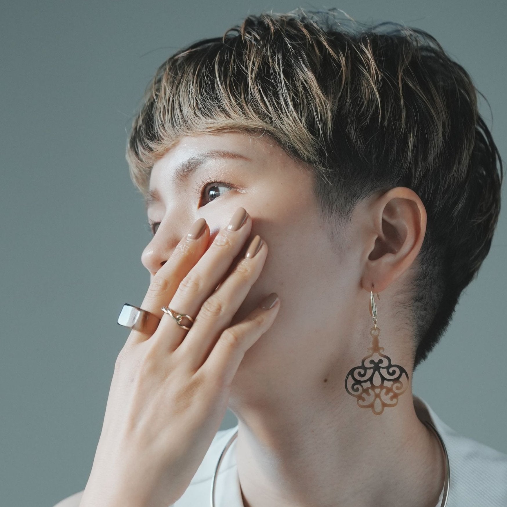 アラビアンなファーストインプレッションをもつデザインですが、身につけると、その軽やかなデザインが動きに合わせて揺れ、花びらが風に舞うような印象に。シンプルな装いにも透明感のある華やぎをプラスできるアイテムです。