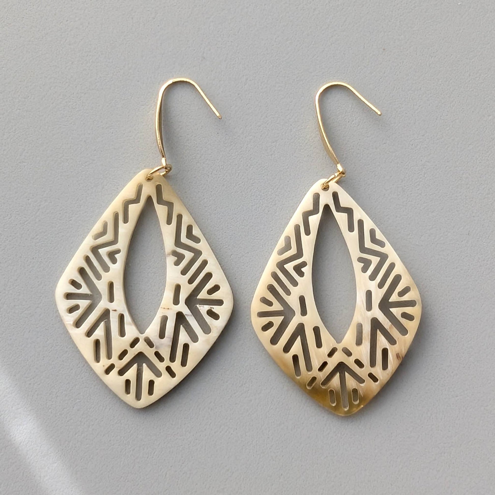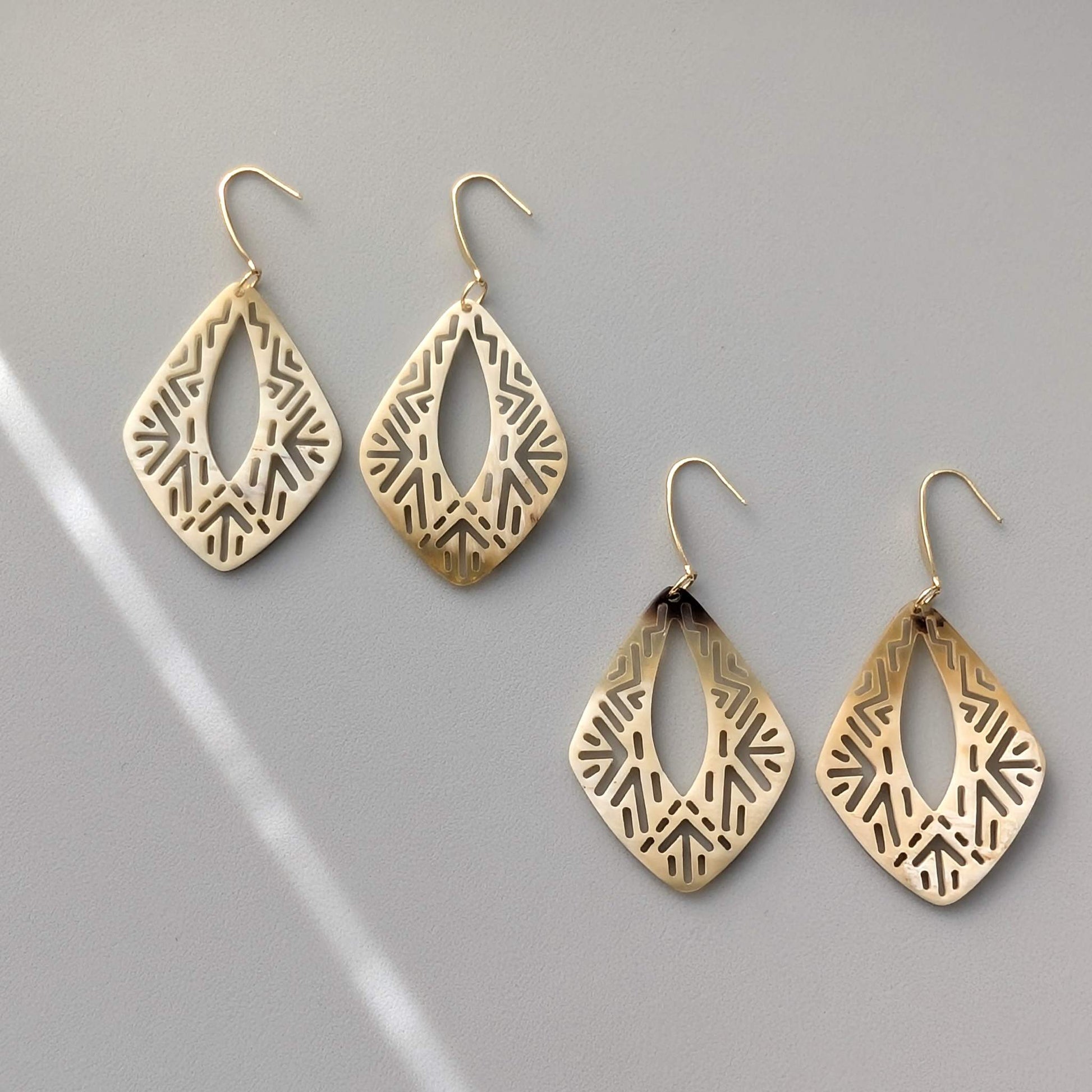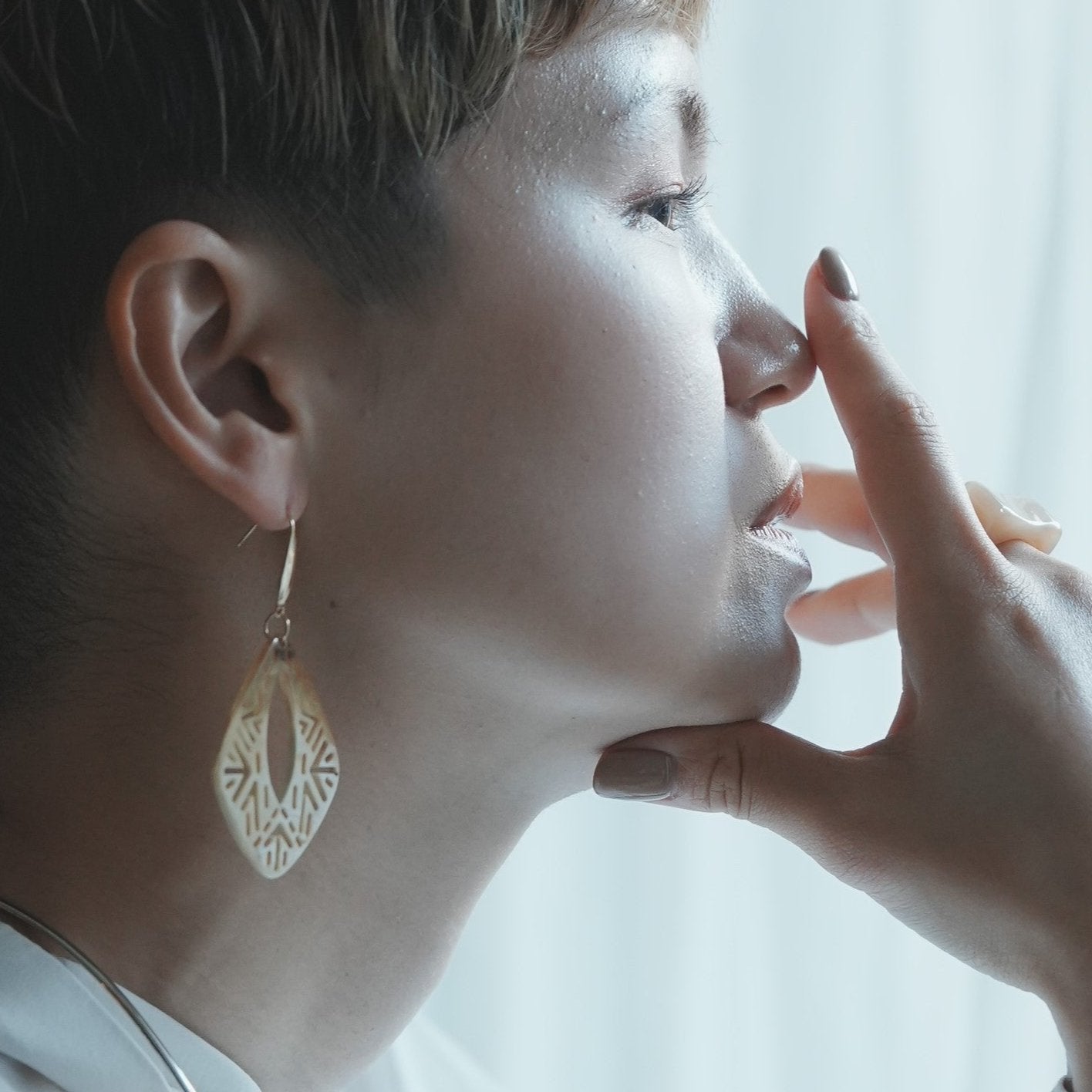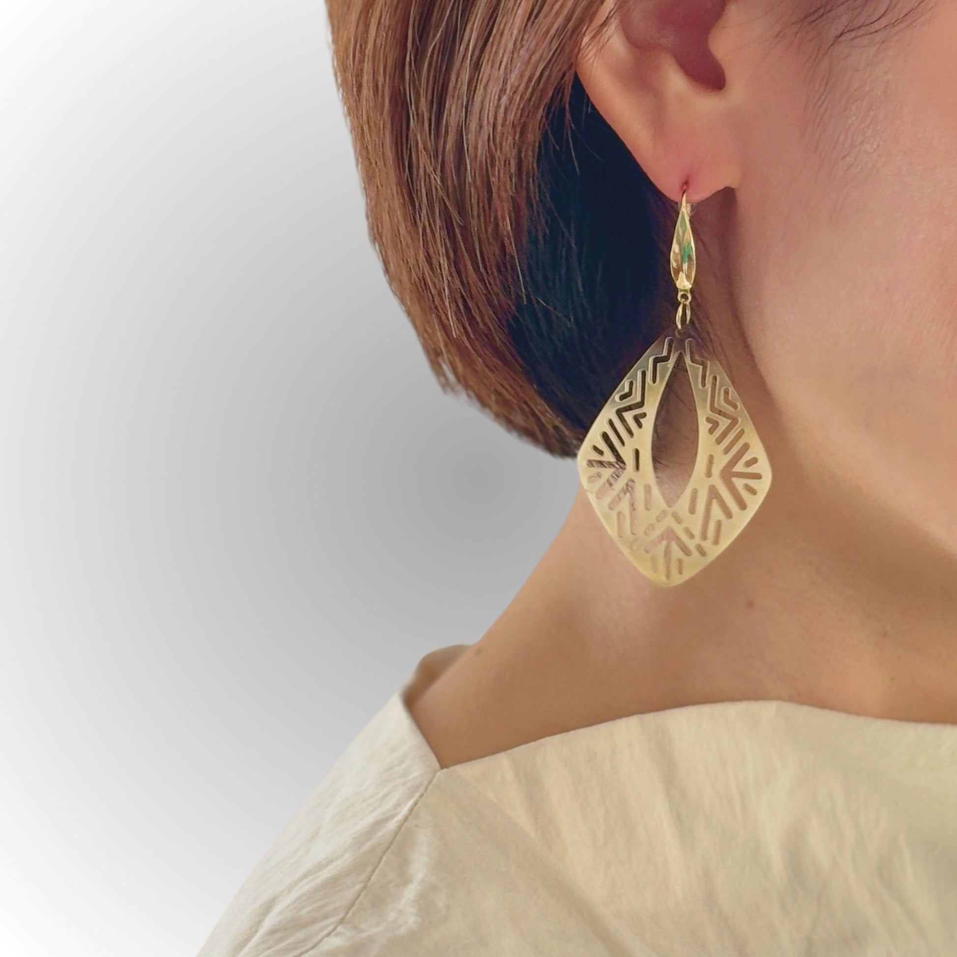 独特の透かし模様が光を通し、軽やかで洗練された印象を与えます。耳元で揺れるたびに上品な存在感を放ち、普段使いにもぴったり。