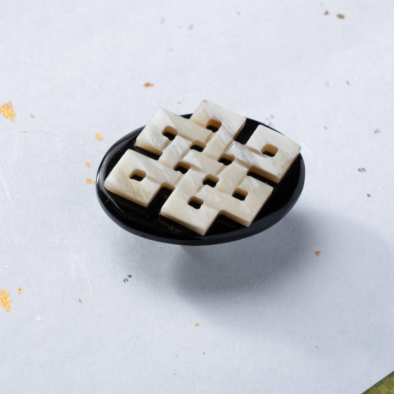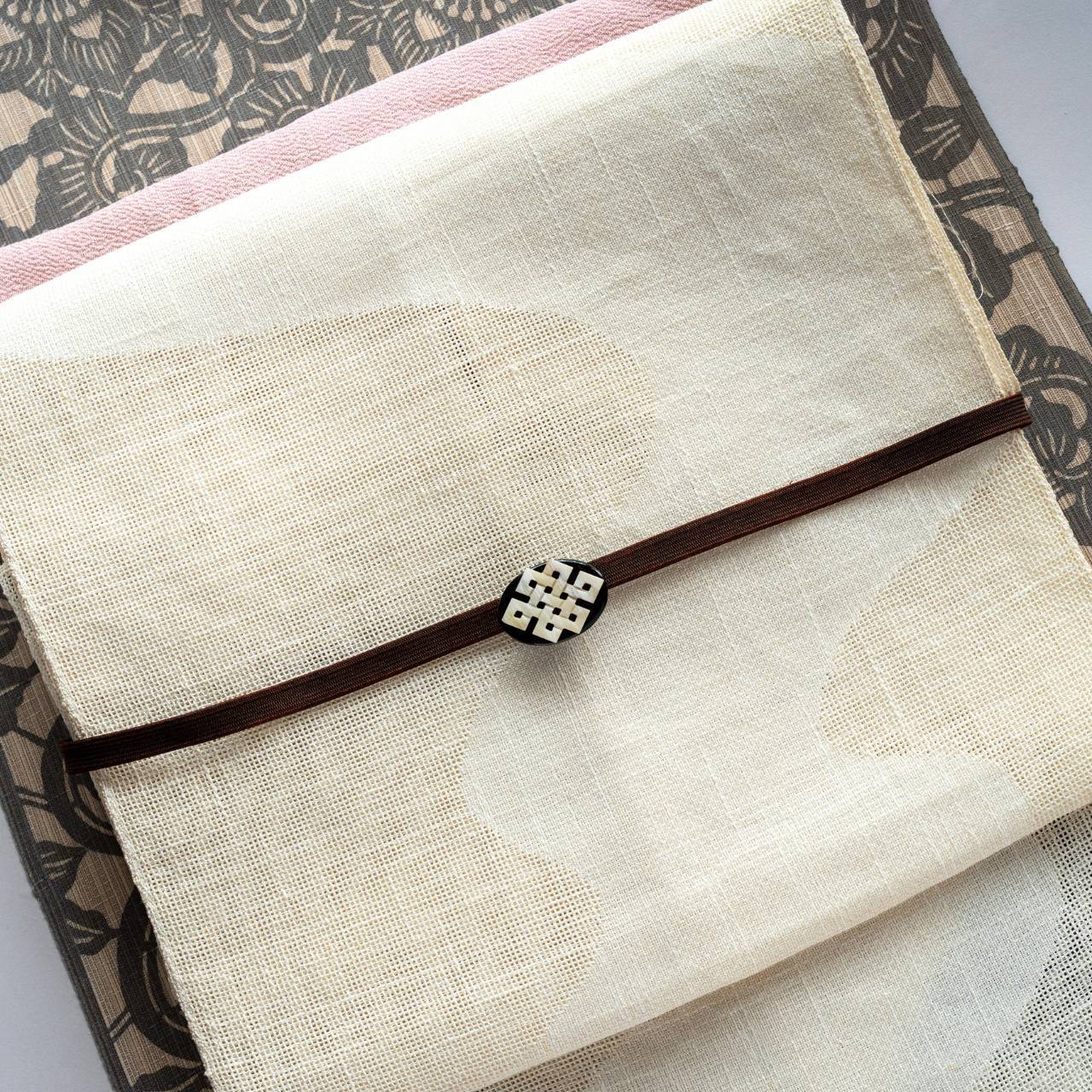 EndlessKnot(永遠の絆)をモチーフに 時の繋がりを表現した帯留め 和のそれぞれのストーリーに深みを添える一品です 〔素材〕 バッファローホーン 〔サイズ〕 本体:横3.5cm✕縦2.5cm 金具:内1.3cm 重さ:約5.5g ※天然素材のため、色味や形、重さに若干の個体差がございます。 *写真の着物は竺仙製