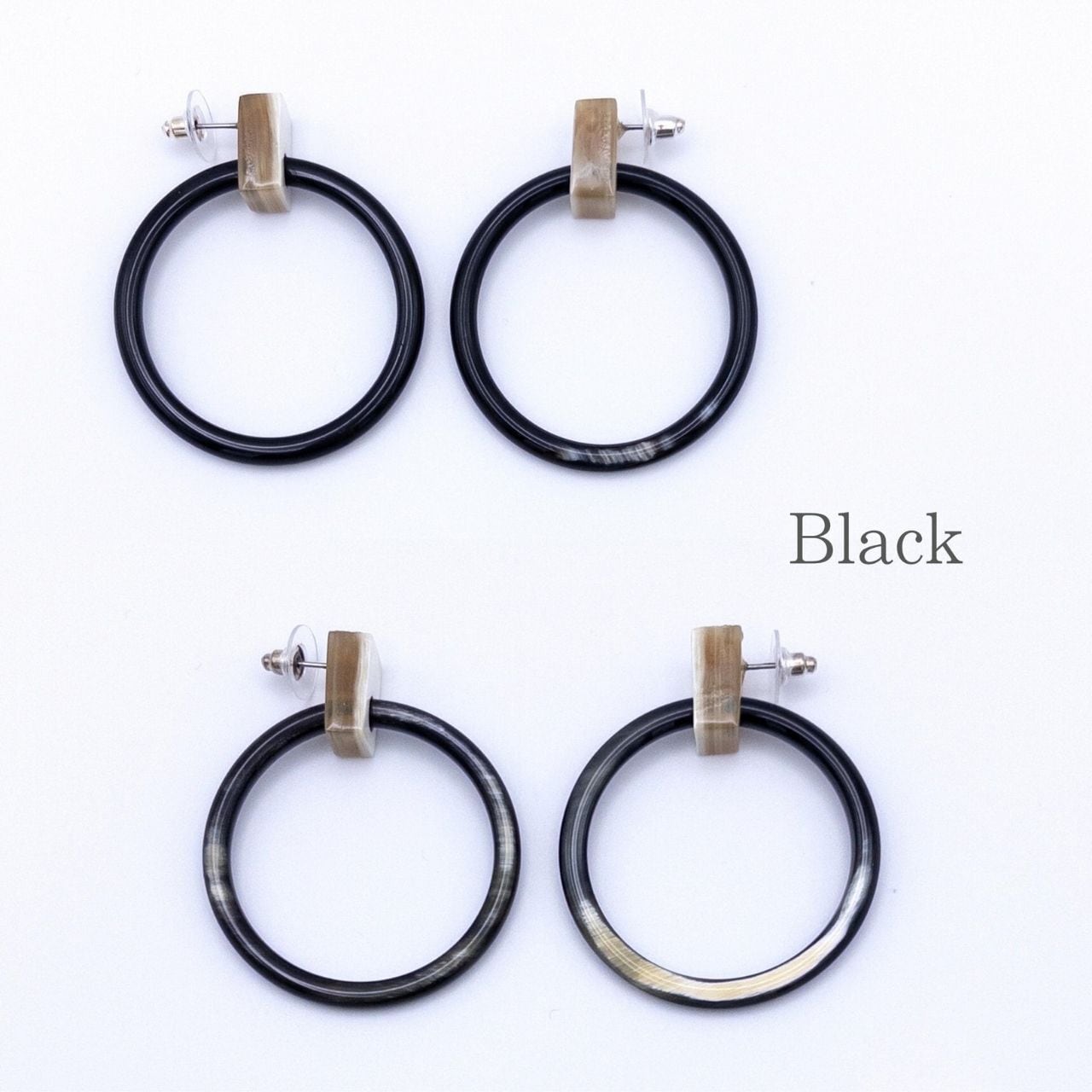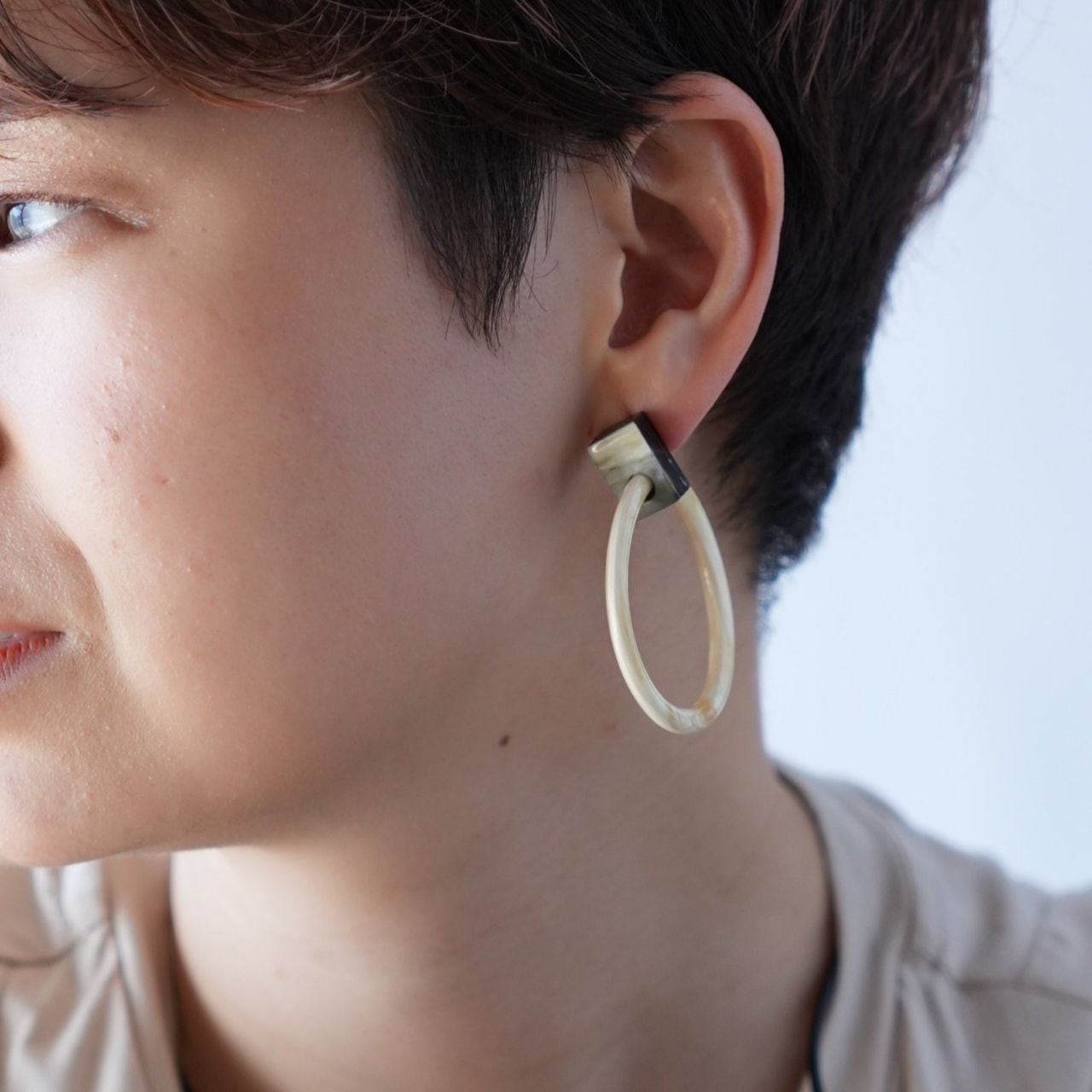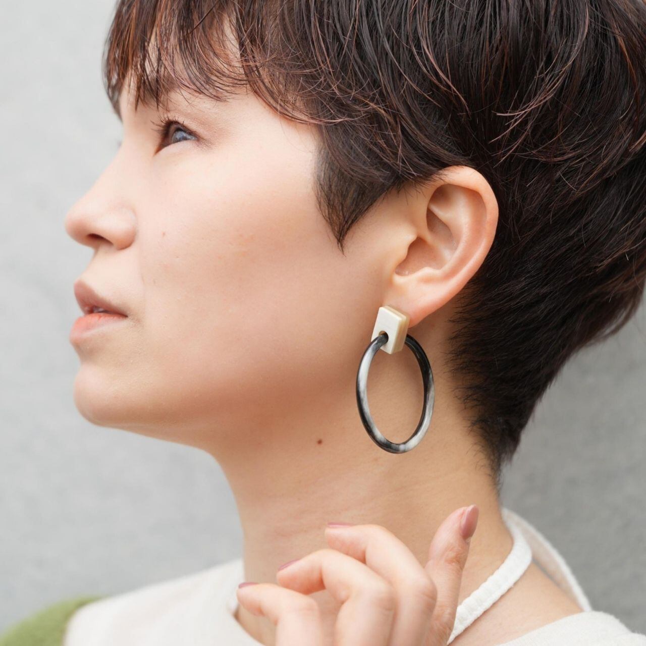 直線と曲線、キューブとサークル。 立体感あるキューブ状のホーンポストに、 細いサークルのホーンが 軽やかに、顔まわりにリズムと陰影をもたらします。 Coolでいて、ぬけ感もあるスタイリッシュなデザイン。 *ピアスのみ 〔素材〕 本体:バッファローホーン 金具:SUS304 〔サイズ〕 本体:5.0cm✕4.5cm 重さ:約3.0g(片耳) ※天然素材のため、色味や形、重さに若干の個体差がございます。天然素材ならではの個性をお楽しみください。