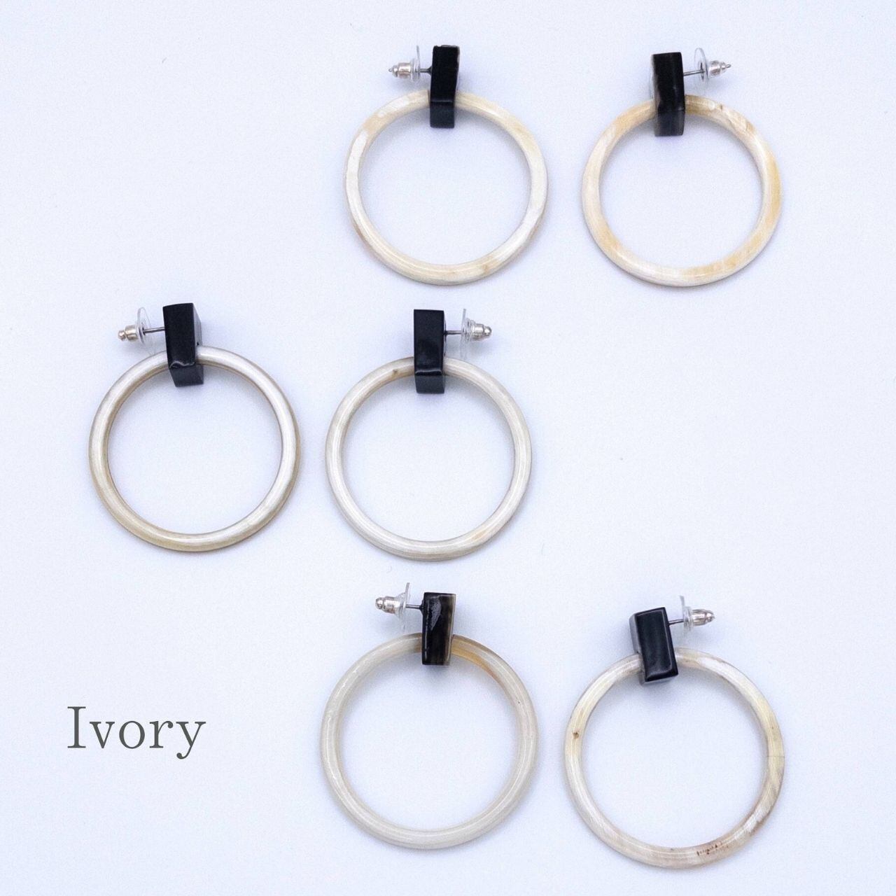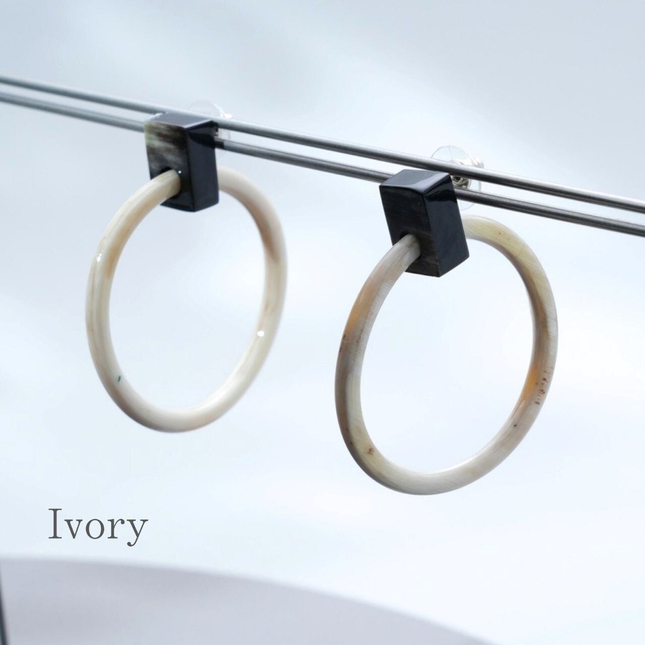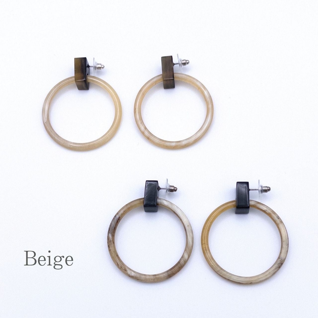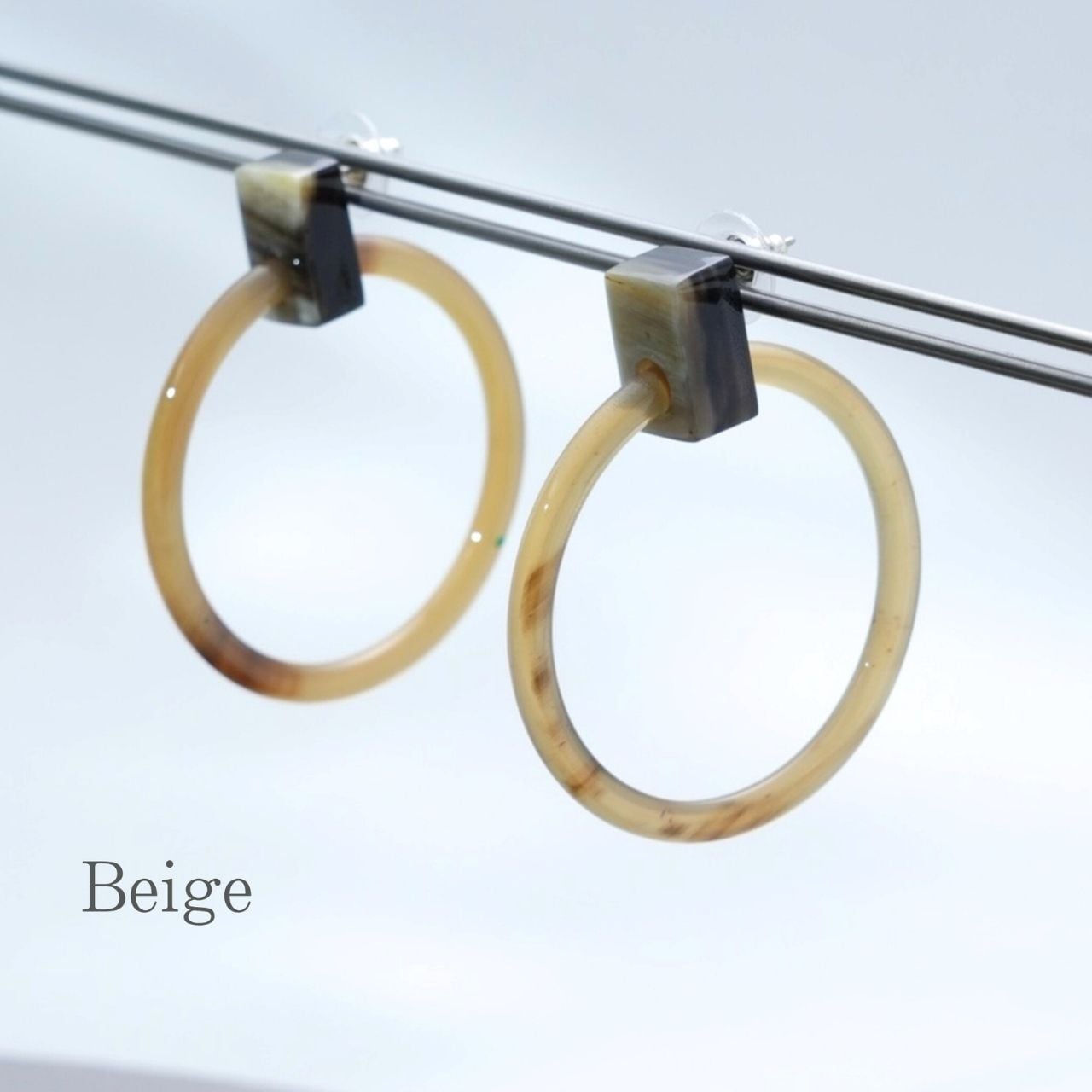 直線と曲線、キューブとサークル。 立体感あるキューブ状のホーンポストに、 細いサークルのホーンが 軽やかに、顔まわりにリズムと陰影をもたらします。 Coolでいて、ぬけ感もあるスタイリッシュなデザイン。 *ピアスのみ 〔素材〕 本体:バッファローホーン 金具:SUS304 〔サイズ〕 本体:5.0cm✕4.5cm 重さ:約3.0g(片耳) ※天然素材のため、色味や形、重さに若干の個体差がございます。天然素材ならではの個性をお楽しみください。