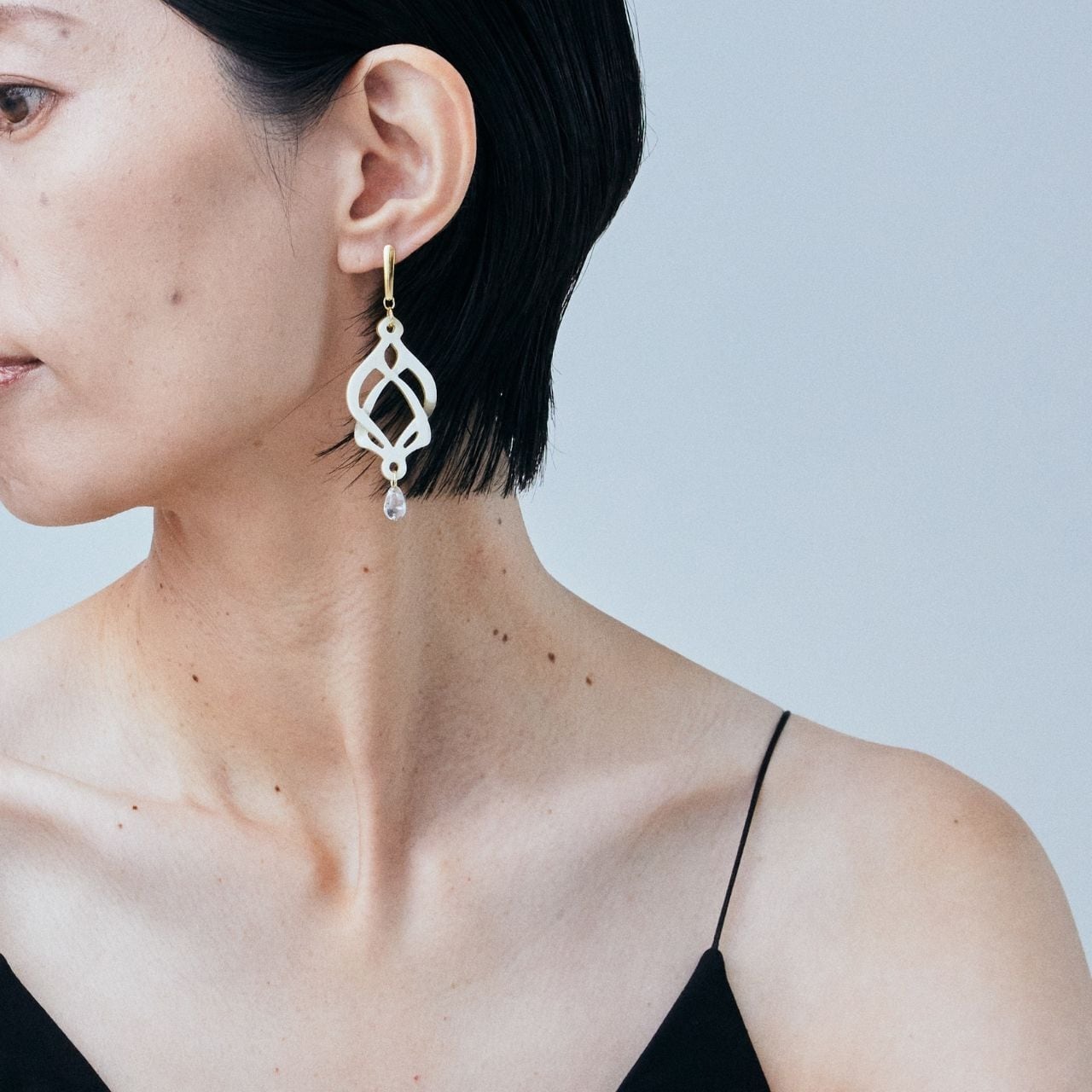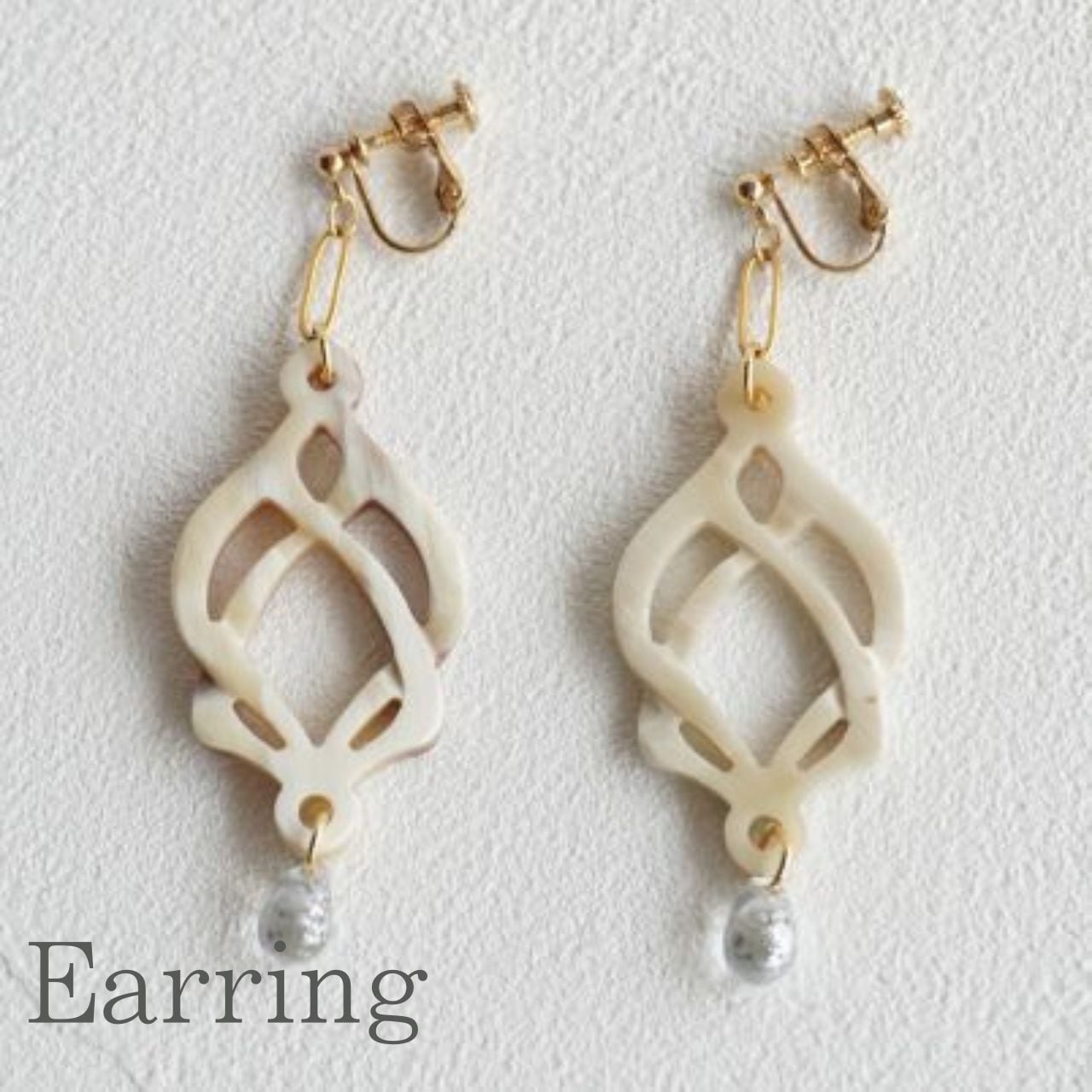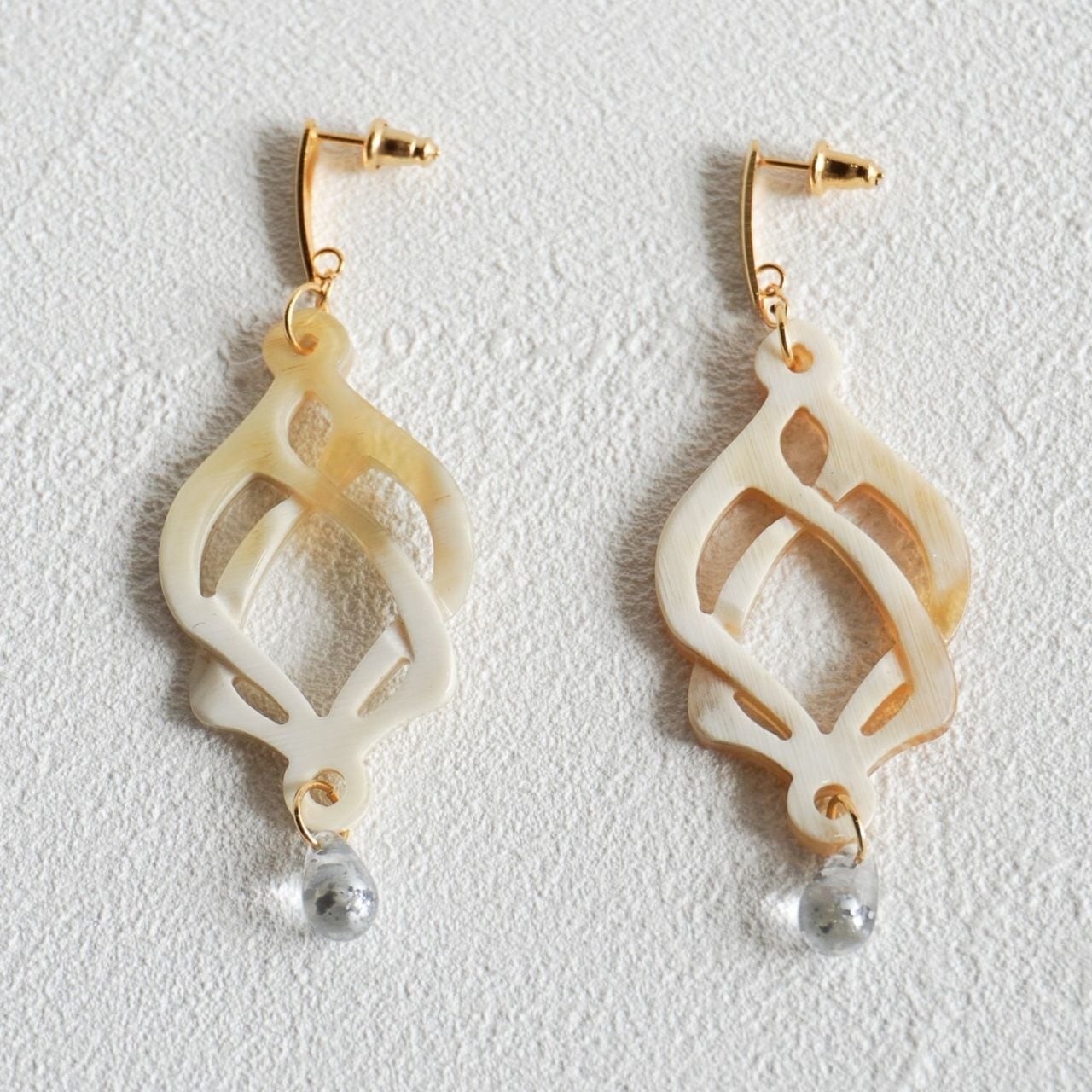 エンドレスノットからインスピレーションを受けたモチーフ 爽やかな箔入りのチェコビーズと合わせて やわらかに装いを惹き立てます。 *ピアスまたはイヤリング(ネジバネ式)をお選びいただけます 〔素材〕 本体:バッファローホーン 金具:SUS316L 〔サイズ〕 本体:7.5✕2.5cm(ポスト部分を含む) 重さ:約2.5g(片耳) ※天然素材のため、色味や形、重さに若干の個体差がございます。天然素材ならではの個性をお楽しみください。