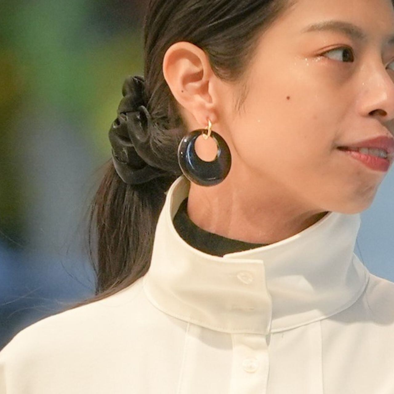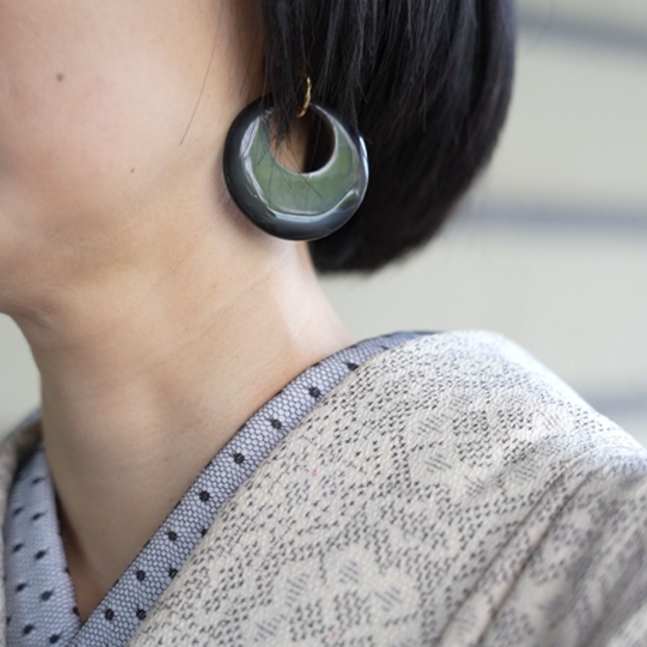 大胆なボリューム感と上品さが共存するピアス。 ぽってりとした丸みのあるフォルムが愛らしさを引き立てつつ、 シックな色味で凛としたクールな印象も演出します。 着物との相性もよいアイテムです。 〔素材〕 本体:バッファローホーン 金具:SUS316L,K16GP 〔サイズ〕 本体:長さ:約5.0cm、幅:約4.0 重さ:約5.5g(片耳) ※天然素材のため、色味や形、重さに若干の個体差がございます。天然素材ならではの個性をお楽しみください。